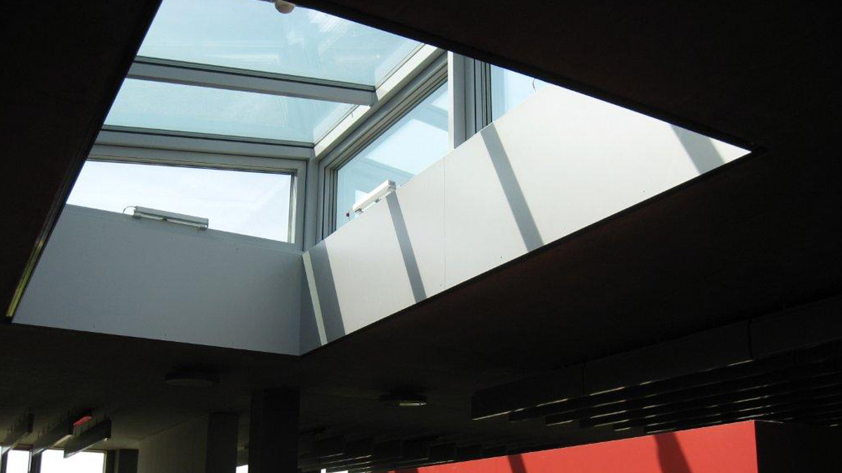 - 2 Shed Roofs LAMILUX CI-System Glass Architecture PR 60 energysave, angle of inclination 3° (4,5m x 8,8m). VSG-glazing with sun protection glass (three layers) divided in 16 glass fields (Ug value 0.7 W/(m²K)). Thermal optimized edge seal with so called warm edge